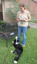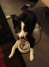 About a year old (or slightly under), neutered, pure bred semi-rough Black and White male. On a scale of 0-10, his energy level was about 20 without the outlet. Today it is about 8-9. With me he understands the concept of: (not necessary verbally) “Sit” “Down” “Wait” “Drop” “Bring” “His name” “Target” “Come here” “Kennel” “Bed” “Back up” “Watch me” “Release/OK” “Off”. Some of his earlier behaviors may come back initially when he goes to his new home so it is highly recommended that he is adopted right before a weekend. He can hold up to 9 hours in his crate. He loves getting attention from people. He still gets nervous about certain types of restrains. He follows me around everywhere, making sure he doesn’t miss any action. It takes a proper and slower introduction but once he is comfortable with a new dog, he will play, chase and share toys with them. He loves to work for toys, water play, attention, praise and food. He is clicker trained and learns new behaviors very quickly when paired up with reward. He seems to be scared of cats and has not been officially tested with them. He’s NOT thunder phobic!