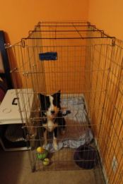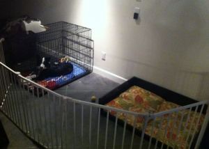 I also added the third place for him. He has a large crate in the doggy den, another crate in the bathroom where he usually stays during the day. I added a tall wire pen in the spare room. I’ll let him sleep there during the long weekend. That way I won’t have to worry about not having enough sleep. Update: He continued to whine in the pen next to me. He started tearing up the blue blanket you see in the picture. That was the fifth bed/blanket he ate. No more blanket for him. He growled and barked at the noises throughout the night.
